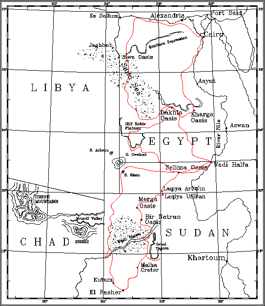 The following map shows the Sahara Desert region covering the countries of Libya, Egypt, Sudan and Chad. The intended expedition route for 2004 is outlined in red and to get a more detailed view of the expedition route click on any part of the map. When the map is enlarged you are able to scroll over specific points on the map and a pop up box will display further details of that specific location. |